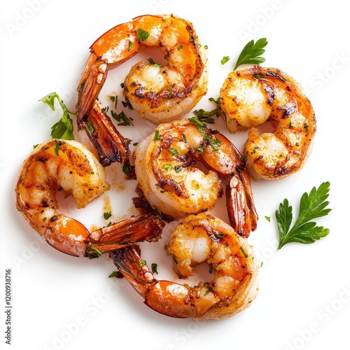 shrimp, grilled, seafood, prawn, food, delicious, meal, dinner, lunch, cookery, tasty, healthy, protein, orange, red, cooked, epicure, plate, white, background, isolated, closeup, top, view, overhead, photo, image, picture, summer, fresh, succulent, juicy, flavorful, spice, herb, parsley, crustacean, seafood, appetising, eatery, receipe, cook, cooking