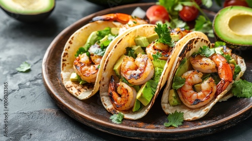 Grilled Shrimp Tacos Topped with Avocado and Cilantro Served on a Rustic Plate