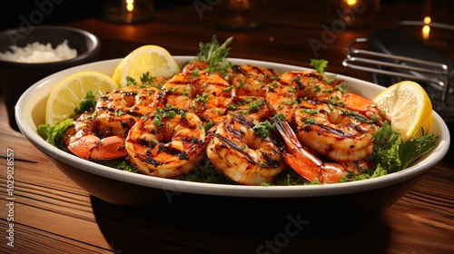 shrimp, grilled, lemon, parsley, lettuce, bowl, white, wooden, table, food, dinner, meal, seafood, healthy, delicious, fresh, tasty, cookery, plate, eatery, kitchen, home, cooking, protein, lunch, epicure, fine dining