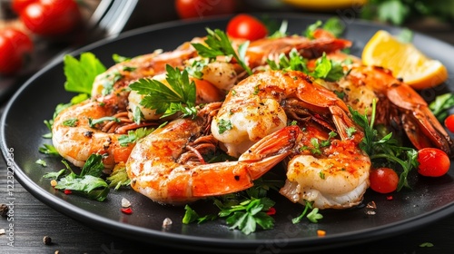 Grilled shrimps with spice in black plate