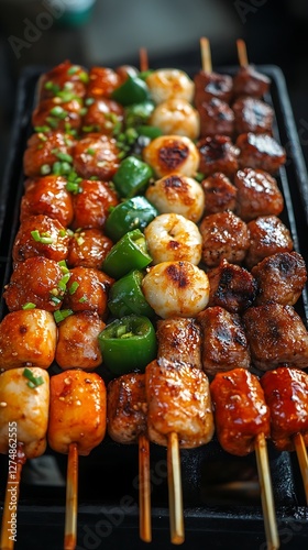 food, skewer, grilled, meat, vegetable, asian, food photography, eatery, bar-b-q, cookery, street, party, closeup, delicious, tasty, colourful, spicey, grilled meat, dinner, appetising, summer, eating, event, festival, party food, cooking, appetiser, presentation, plate, tray, hot