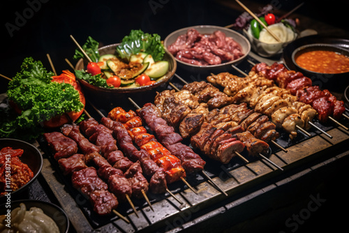 grill, skewer, meat, vegetable, platter, sauce, bar-b-q, food, cookery, cooking, mark, dining, meal, fresh, herb, tomatoes, pepper, garnish, smoke, favor, hearty, tasty, eatery, culinary, epicure, asian, feast, picnic, buffet, charcoal, method, vegetarian, marinated, succulent, seasoning, dish, party, spice, presentation, vibrant, raw, ingredient, styling