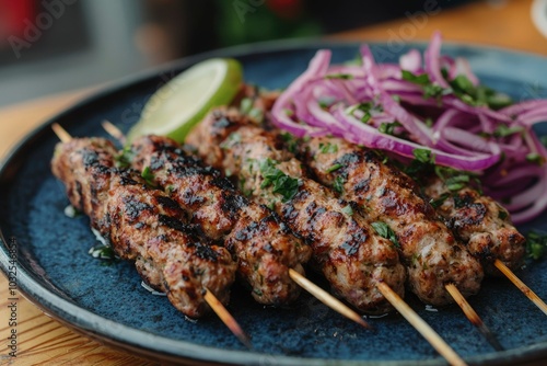grilled, skewer, meat, red, onion, parsley, garnish, food, dish, plate, blue, wooden, table, skewer, stick, macro, culinary, delicious, cookery, savoury, flavorful, juicy, protein, healthy, dinner, lunch, eatery, cooking, kitchen, tasty, favor, spice, seasoning