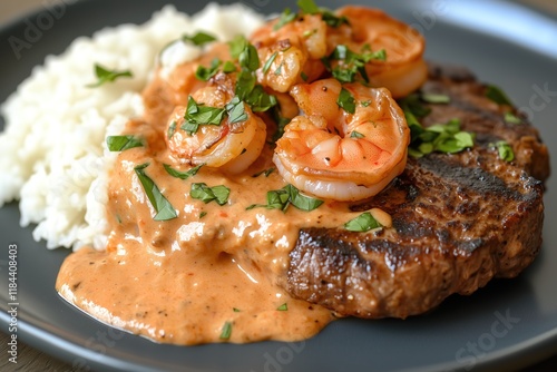 Grilled steak and shrimp with creamy paprika sauce and rice on a gray plate, a delicious and protein-rich surf and turf meal.
