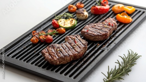 steak, grilled, vegetable, griddle, food, cooking, dinner, meal, receipe, healthy, tasty, delicious, dinnerware, bar-b-q, grill, indoor, meat, protein, kitchen, homemade, eatery, easy, simple, preparation, fresh, organic, seasoning, pepper, salt, cherry, tomatoes, courgette, bell, onion, herb, rosemary, party, summer, epicure, side, dish, serving, plate, tray