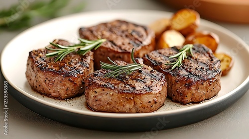Grilled steak medallions garnished with rosemary served alongside roasted potatoes on a plate