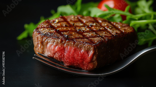 steak, grilled, meat, food, protein, delicious, juicy, tender, dinner, meal, eatery, food photography, closeup, macro, fork, knife, plate, black background, arugula, salad, red, bar-b-q, grill, summer, cooking, culinary, receipe, epicure, high-quality, fresh, healthy, tasty, appetence, hunger, eating, diet, nourishment, kitchen, red meat, medium, rare