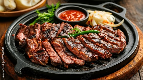 Grilled steak served on a sizzling platter with sauce and garnish.