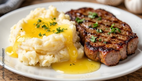 Grilled steak served with mashed potatoes and golden sauce on plate