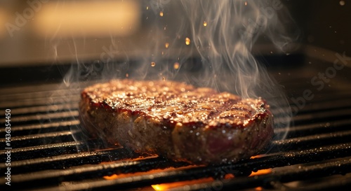 Grilled steak sizzling over hot grill with smoke rising