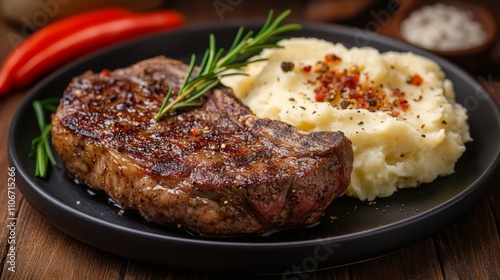 steak, grilled, beef, meat, protein, food, meal, dinner, lunch, mashed, potato, potato, rosemary, herb, garnish, black, plate, wooden, table, pepper, salt, seasoning, culinary, delicious, savoury, juicy, brown, creamy, side, dish, cookery, favor, tasty, appetising, homemade, rustic, closeup, fresh