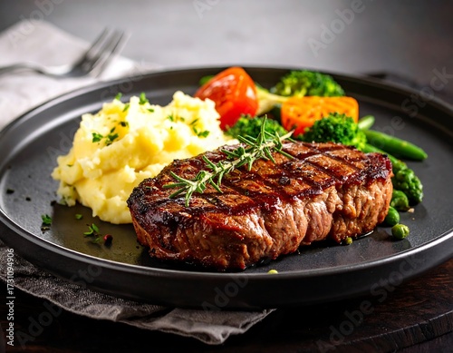 steak, grilled, mashed, potato, vegetable, plate, food, dinner, meal, protein, healthy, delicious, appetising, closeup, tasty, juicy, brown, dark, rustic, fork, roman, seasoned, cooked, fresh, eatery, organic, dish, modern, served, image, high-quality, photo, bright, natural, balanced, nourishing, comfort, setting