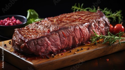 Grilled steak with melted barbeque sauce on a black and blurry background
