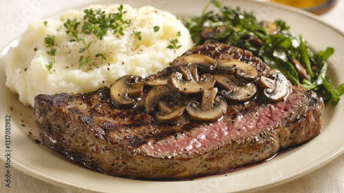 Grilled steak with mushroom sauce, mashed potatoes, and greens