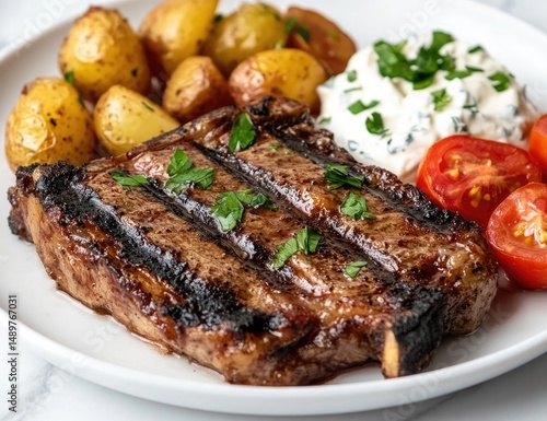 steak, grilled, roasted, potato, creamy, sauce, tomatoes, parsley, dinner, meal, protein, food, delicious, juicy, tender, flavorful, seasoned, cooked, plate, white, dish, healthy, balanced, eatery, tasty, appetising, side, image, closeup, brown, yellow, red, fresh, comfort, simple, easy, classic, epicure, home, serving, deliciously, savoury