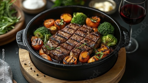 Grilled steak with vegetables in a pan with a glass of red wine.