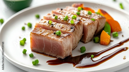 Grilled tuna steak served with vibrant vegetables and sauce on a white plate for a gourmet dining experience