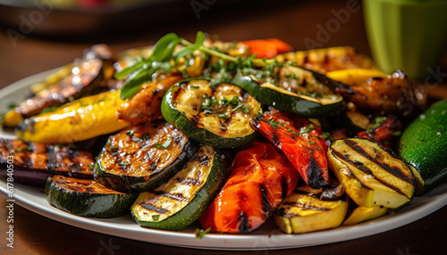 Grilled vegetable plate with eggplant, tomato, and yellow bell pepper generated by AI
