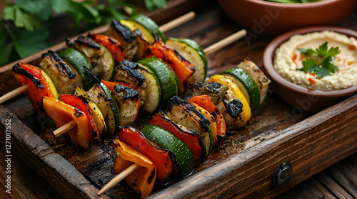 Grilled vegetable skewers featuring zucchini, onions, peppers, served with a side of creamy dip.