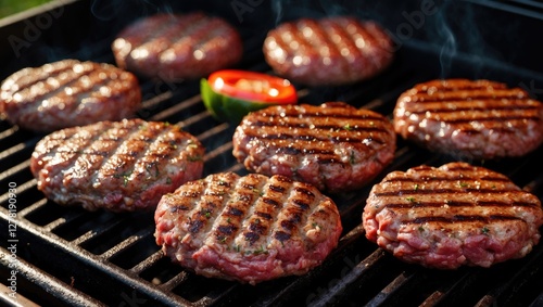 Grilling beef patties with grill marks on outdoor barbecue with smoke and fresh vegetables on a grill rack