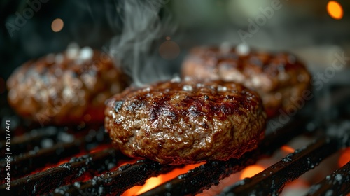 Grilling Process close-ups of the burger patty sizzling on the grill development of a savory crust