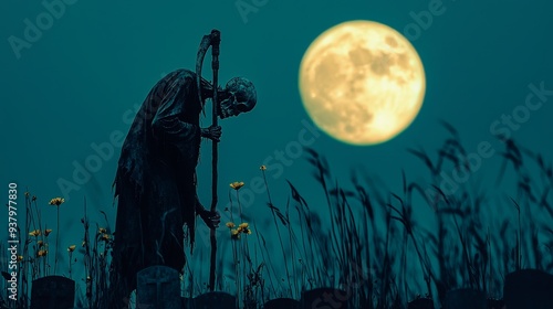 Grim reaper's silhouette against a full moon, skeletal hands gripping a scythe, graves and wilted flowers in the foreground, hauntingly beautiful yet terrifying image
