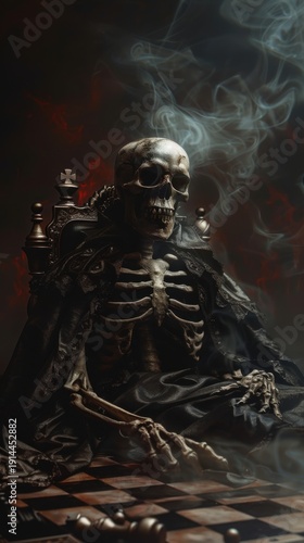 skeleton, skull, death, grisly, king, monarch, throne, dark, gothic, horror, fantasy, chess, game, strategy, evil, occult, grim, reaper, skittish, eerie, haunted, bone, bone, figure, character, drapery, smoke, mist, dramatic, antique, vintage, mediaeval, royals, solemn, brooding, ancient, mystical, haunting, sinister, atmosphere, supernatural, costume, lord, dominion, decay, mortality, ruin
