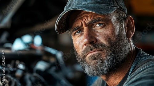 man, portrait, closeup, beard, grime, face, baseball, cap, dark, background, engine, serious, expression, mechanic, men at work, industrial, gritty, texture, detailed, intense, determination, hard, work, labor, masculine, mature, adult, professional, occupation, blue, eye, focused, gaze, powerful, strong, weathered, worn, rough, manly, grit, dirt, oil, machinery, repair, maintenance, industry, working man, skilled, trade