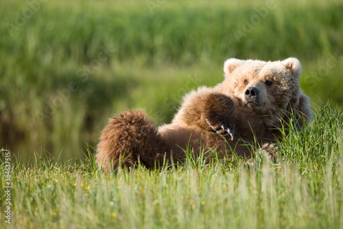 north america, us, us, alaska, outdoors, horizontal, brown, green, solitude, individuality, funny, humorous, brown bear, grizzly, meadow, coastal, resting, humor, wildlife, nature, wilderness, closeup, closeup, nobody, no people, one animal, 1, day, daytime, daylight, summer, sunny, sunshine, color image