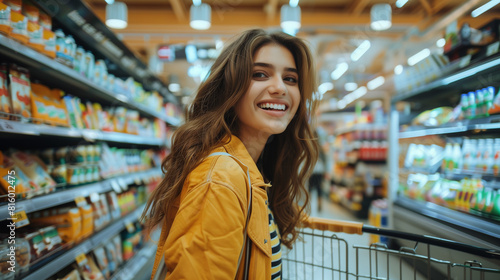 Grocery Shopping Happiness: Smiling Young Woman Joyfully Pushing Shopping Cart in Supermarket – Happy Shopper, Retail Therapy, Consumer Satisfaction