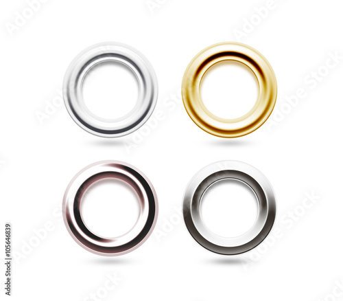 Grommets set isolated. Metal, brass, steel, gold, silver eyelets.