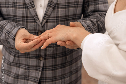 Groom in a wedding suit puts a ring on the finger of a bride in beautiful white dress. An exciting moment of the wedding ceremony