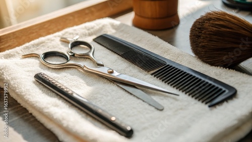 grooming, scissors, comb, razor, brush, wooden, hair, cutting, styling, barber, equipment, hygiene, beauty, tool, relaxation, cleanliness, service, elegance, preparation, salon, workspace, natural light, craftsmanship, precision, aesthetic, professional, tradition, barbershop, cosy, comfort, detail, composition, textile, surface, arrangement, neat, organised, essential, minimalist