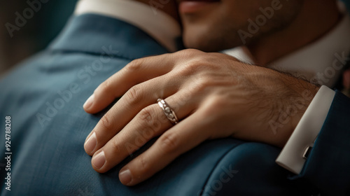 wedding, groom, hand, ring, band, ceremony, love, marriage, commitment, hugs, shoulder, suit, couple, gay, equality, acceptance, celebration, togetherness, partnership, happiness, joy, forever, husband, partner, oneness, bond, affection, closeup, detail, shot, day, special, story, romance, intimacy, gentle, touch, gesture, symbol, expression, feeling, emotion, attire, formal, wear, tuxedo, photographer