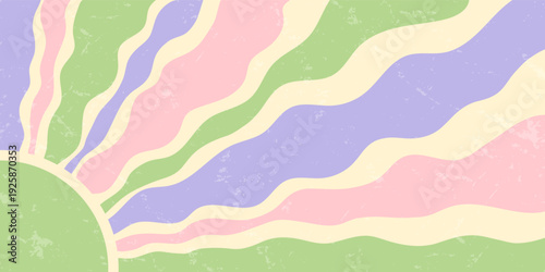 Groovy retro sun burst and pastel ray swirl with bold yellow sunshine, sun and wave style. Grungy background evokes y2k energy, artistic grunge burst for contemporary creative use, horizontal