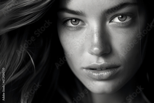 gros plan noir et blanc d'une jeune femme au regard clair avec tâches de rousseurs sur le visage