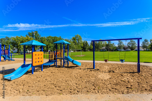 colourful, day, empty, equipment, foliage, fun, grass, green, landscape, lawn, nature, outside, park, plastic, play, playground, recreation, tree