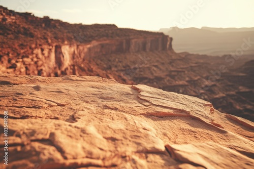 Ground level angle view, surface of smooth sandstone, with a cinematic surrounding of hazy canyon ridges, warm golden lighting, and soft peach tones, showcasing copy space, ad promo template