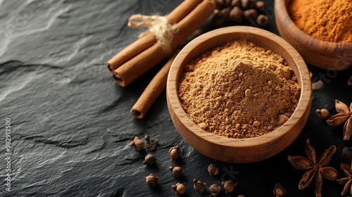 Ground Nutmeg and Cloves: A small wooden dish with ground nutmeg and cloves mixed together, surrounded by whole spices on a dark slate surface.