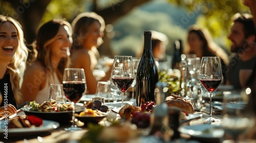 Group enjoying a meal outdoors, laughter, fine wine, and a beautifully set table.