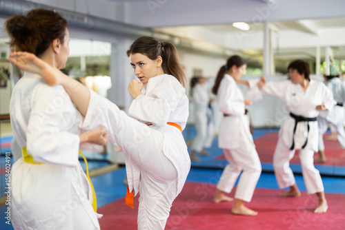 young, youth, adult, woman, female, caucasian, american, club, lifestyle, leisure, indoor, active, exercising, exercise, physical exercise, studio, gym, sport, motion, position, physical, class, practice, motivated, body, power, strength, strong, karate, martial, art, kimono, uniform, belt, karateka, fighter, taekwondo, defense, fight, judo, kata, coach, kick, punch