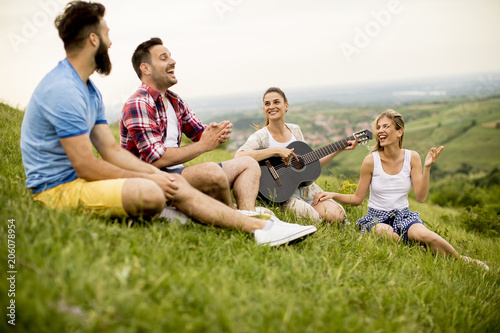 adventure, caucasian, cheerful, enjoying, excursion, female, friends, friendship, fun, green, group, happiness, happy, healthy, hiking, lifestyle, love, male, man, nature, outdoors, people, sitting, smiling, summer, together, travel, trip, vacation, woman, young, guitar, music, playing