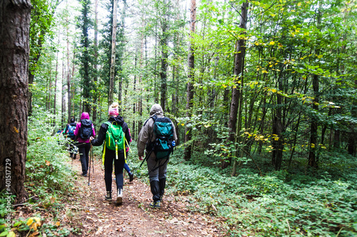 Group of active people hiking on autumn day through beautiful nature landscape. Real unrecognizable hikers, rearview, cloudy sky in the background.