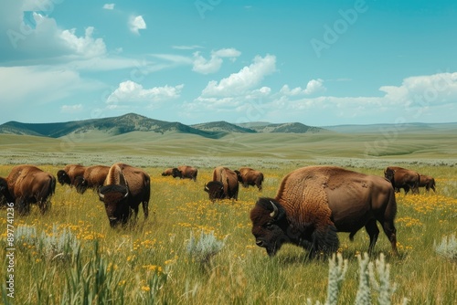 group, bison, grazing, huge, animal, herd, nature, meadow, horizontal, majestic, mammal, photo, us, grass, environment, plain, wilderness, wildlife, color image, hill, pasture, mountain, land, large, farm animal, scenery, bull, horned, national park, north america, rural, travel destination, animal themes, field, brown, countryside, forest, landscape, awe, canada, drive