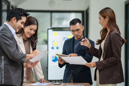 Group of business people are standing in a meeting presenting their work at the office.