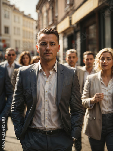Group of business people gathered on sunny city street, Corporate professionals enjoying free time after work hours, corporate meeting outdoors, urban business concept. Generative AI