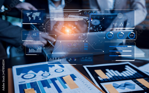 Group of Business people hands working on network and digital finance marketing chart with future technology innovation and digital transformation concept.