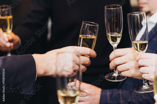 Group of businessmen celebrate, closing successful concluded deal, guests clinking raise glasses with alcohol, sparkling wine, toasting and cheering, colleagues team in office on corporate party event