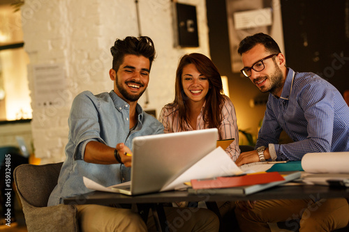Group of casual concept designers working on new project .They using laptop and discuss about concept.Solving problems with positive attitude.