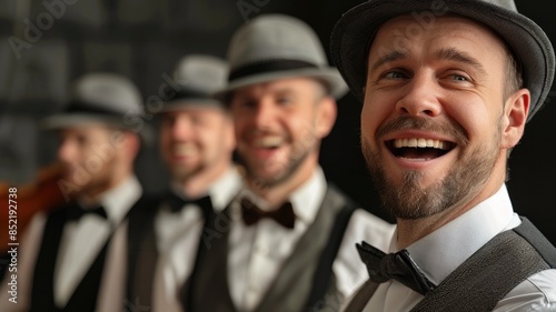 Group of Caucasian men smiling and laughing wearing vests, bowties, hats